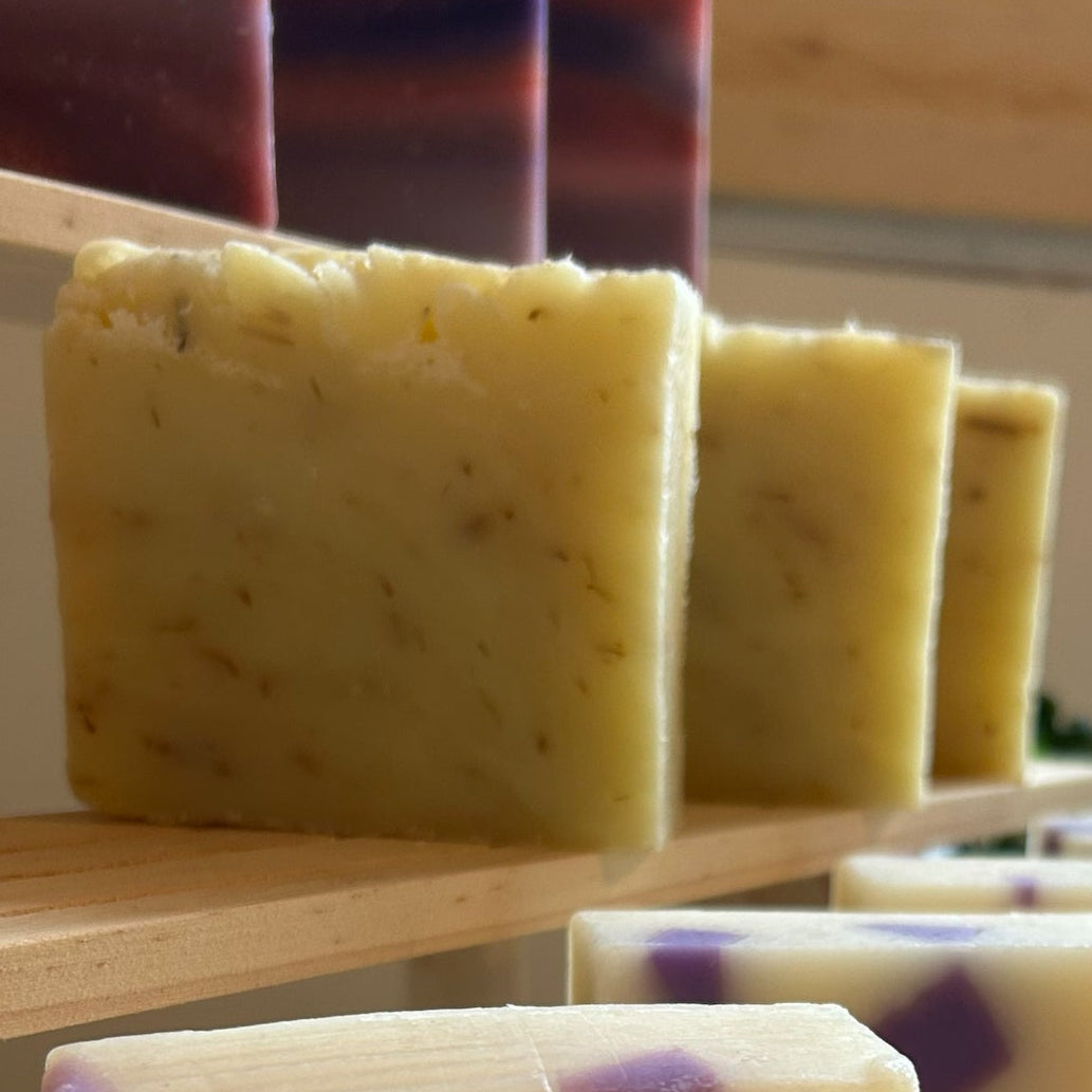LEMONGRASS - Vegan Botanical Handmade Soap is crafted with olive oil, water, coconut oil, sodium hydroxide, organic palm oil, shea butter, lemongrass essential oil, lemongrass herb, and rosemary extract for a natural, botanical cleanse.